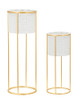 Par bijelih metalnih držača za vaze elegantno ukrašen pravilnim geometrijskim rezbarijama. U kompletu sa zlatnim metalnim nosačem. Lonci se mogu skinuti s nosača.;Boja: Bijela i Zlatna;Materijal: Željezo